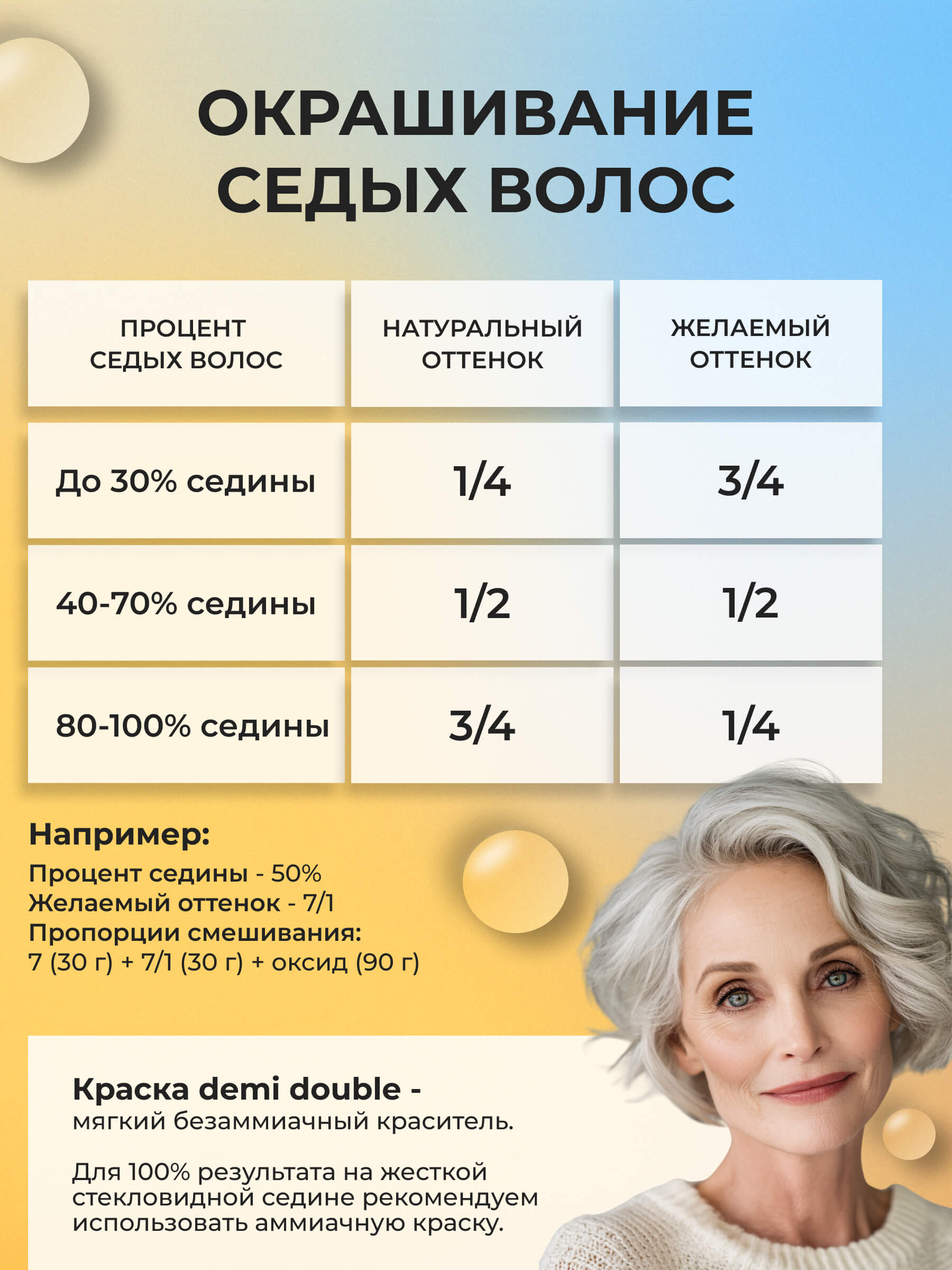 Demi Double Multiservice Haircolor - это красители, которые можно использовать как деми-перманентные краски для тонирующего полустойкого окрашивания волос, а также как перманентные красители для стойкого окрашивания и покрытия седины до 80-100%.